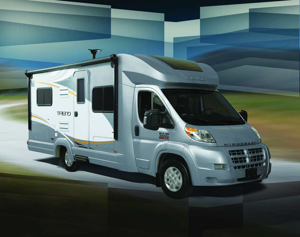 Blaze New Trails ウィネベーゴから米国ラム・プロマスターをベースにしたコンパクトクラスC「トレンド」が発売されました。Chrysler製のV6ガソリンエンジンと6速オートマチックトランスミッションを搭載した新ジャンルのモーターホームシャーシです。キャブには6つのSRSエアバックが装備され、ESC(横滑り防止装置)やトラクションコントロールなどの安全面も充実しています。23フィートモデルのトレンドは2つのフロアプランがリリースされました。どちらのモデルも新機構として電動スタジオロフトベッドが備わり、限られた室内を合理的に使えるようになりました。また、リビングルームの前向きダイネットシートには米国RV業界としては初採用となる3点式シートベルトが装着されコーチパッセンジャーの安全性も向上しています。全長7.3m、全幅2.3mサイズの欧州調でスタイリッシュなアメリカンモーターホームの誕生です。 |